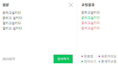 네이버에서 서비스하는 맞춤법 검사기입니다. 한 번에 검사가 가능한 최대 글자 수는 500자입니다.